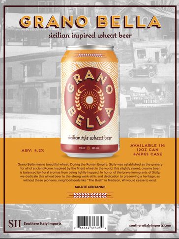 Grano Bella means beautiful wheat. During the Roman Empire, Sicily was established as the granary for all of Rome. Inspired by the finest wheat in the world, this slightly sweet, creamy beer is balanced by floral aromas from being lightly hopped. In honor of the brave immigrants of Sicily, we dedicate this wheat beer to the strong work ethic and dedication to preserving a heritage, as without these pioneers, neighborhoods like "The Bush" in Madison, WI would cease to exist.
